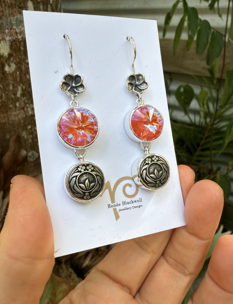 Shimmering Peach Swarovski Crystal & Vintage Button Earrings #817HH