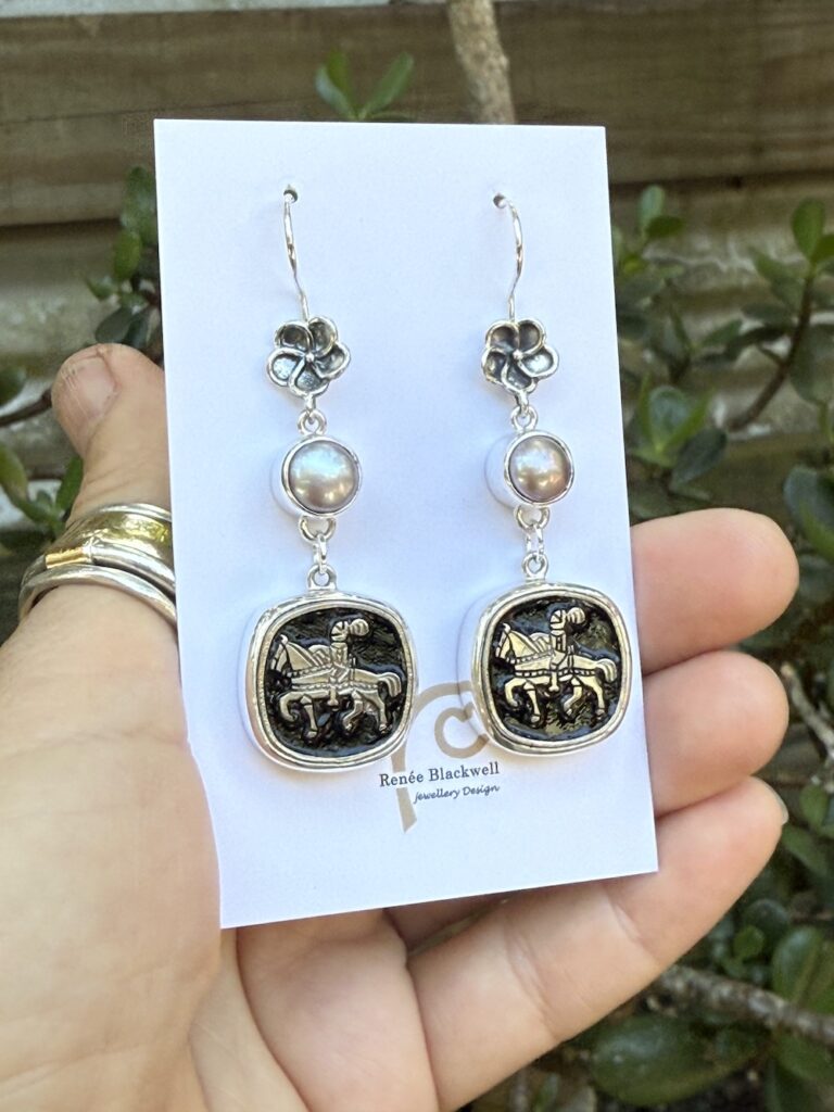 Amazing Vintage “Knight on Horse” Vintage Button & Pearl Earrings! #CGT55