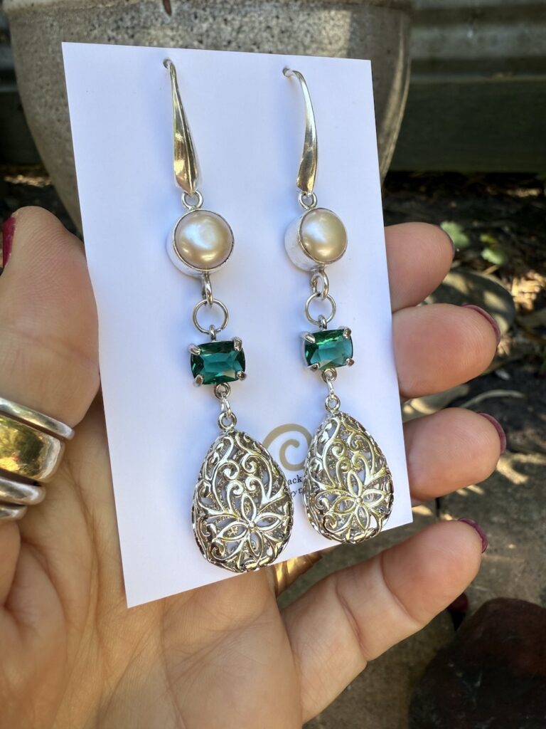 Stunning! Pearl, Green Crystal & Sterling Silver Earrings #WQX2