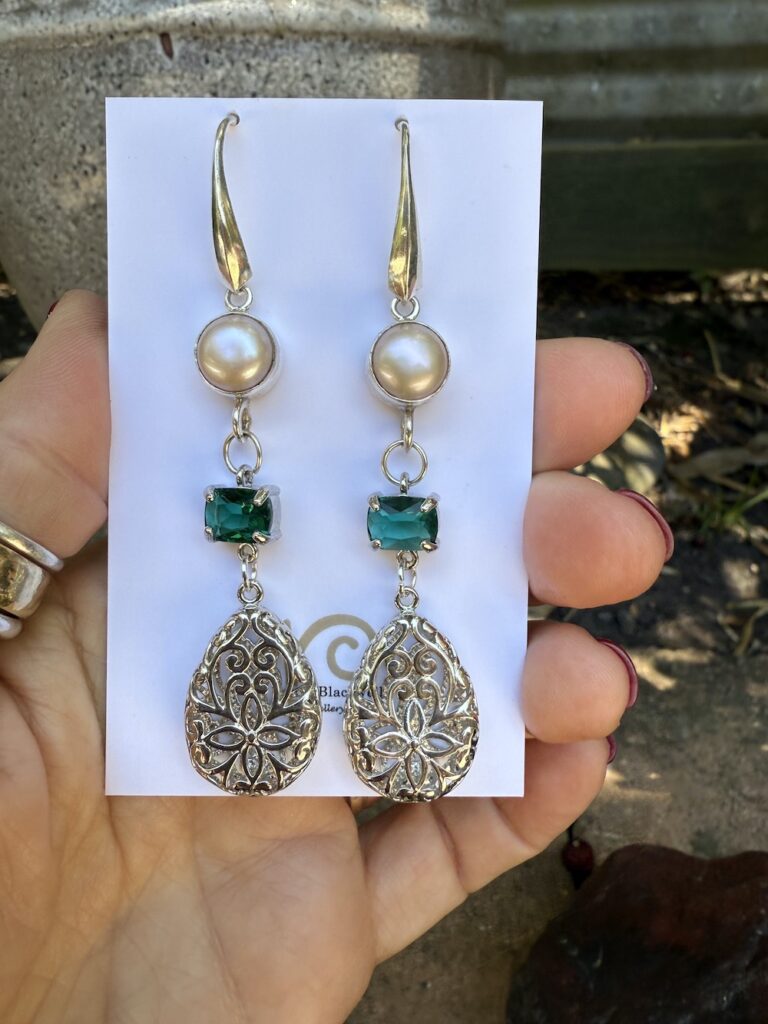 Stunning! Pearl, Green Crystal & Sterling Silver Earrings #WQX2