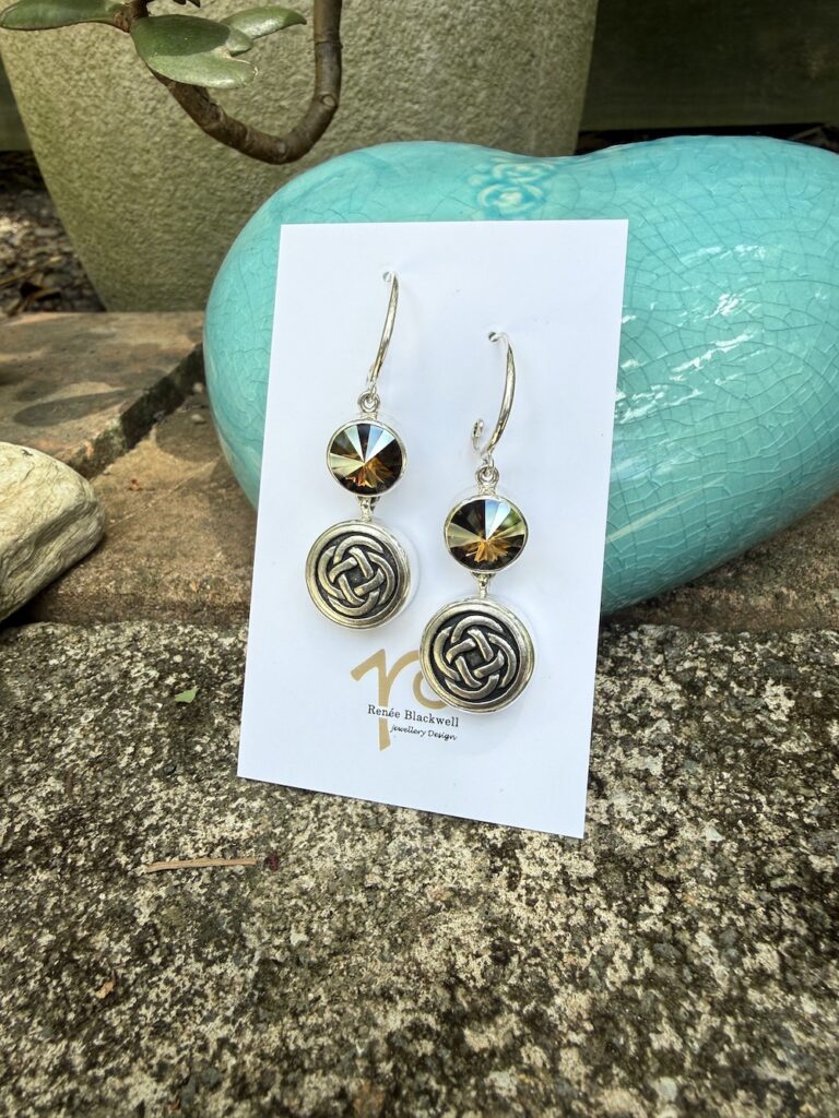 Vintage Celtic Knot Button & Swarovski Crystal Earrings #ACD55