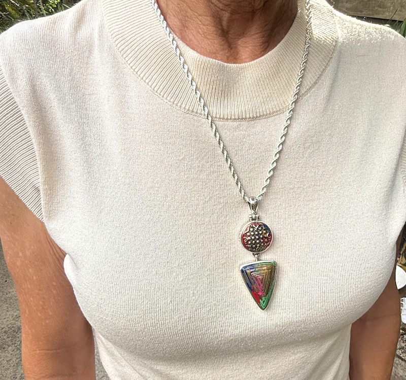 Renee says: ”I have “Colour Washed” the 1800’s era brass button and V component featured in this piece, in beautiful shades of green, blue, red and pink, then burnished to achieve the lovely “Old World” patina. Set as always in sterling silver this pendant will never date or go out of style, truly “Wearable History.” There really are not enough words to accurately describe how delightful and unique this piece is, one of my favorites! Scroll thru’ images for up close peek at another one of a kind treasure, fresh from the studio!”