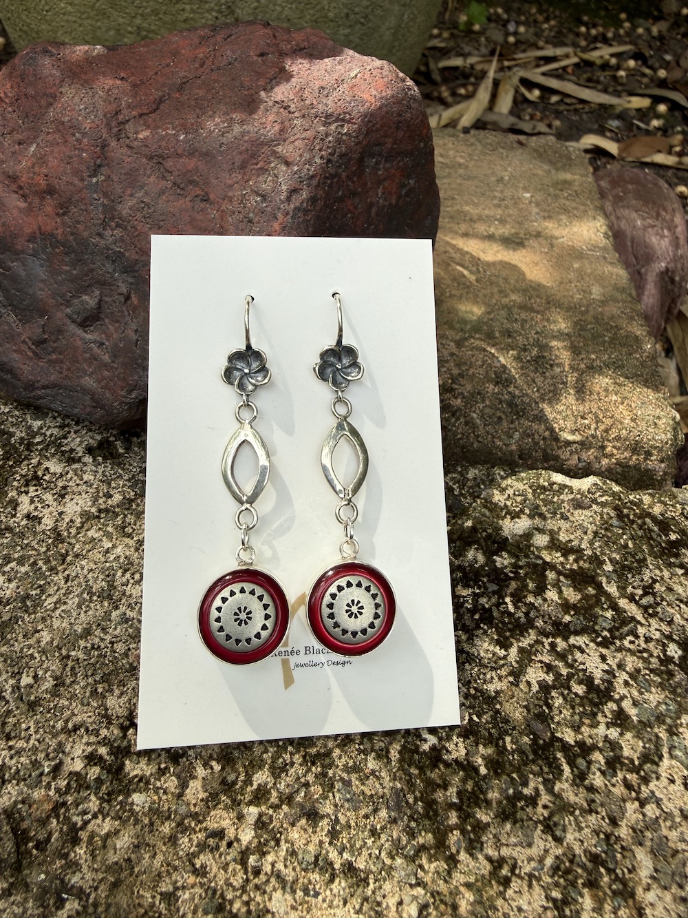 Renée says: “Vintage Button Earrings of the Week!” Lovely vintage 1950’s era French buttons set in sterling silver dancing from the elongated silver oval & sterling silver ear wire. This is my new style ear wire with a detailed flower for added charm. The buttons are a deep burgundy-wine colour, with silver details in the center. Light & easy on the ears, this is a pair you will reach for over & over, never dating or going out of style. Vintage French button earrings…keepsakes from a bygone era to cherish today! Scroll thru’ images for up close peek.”