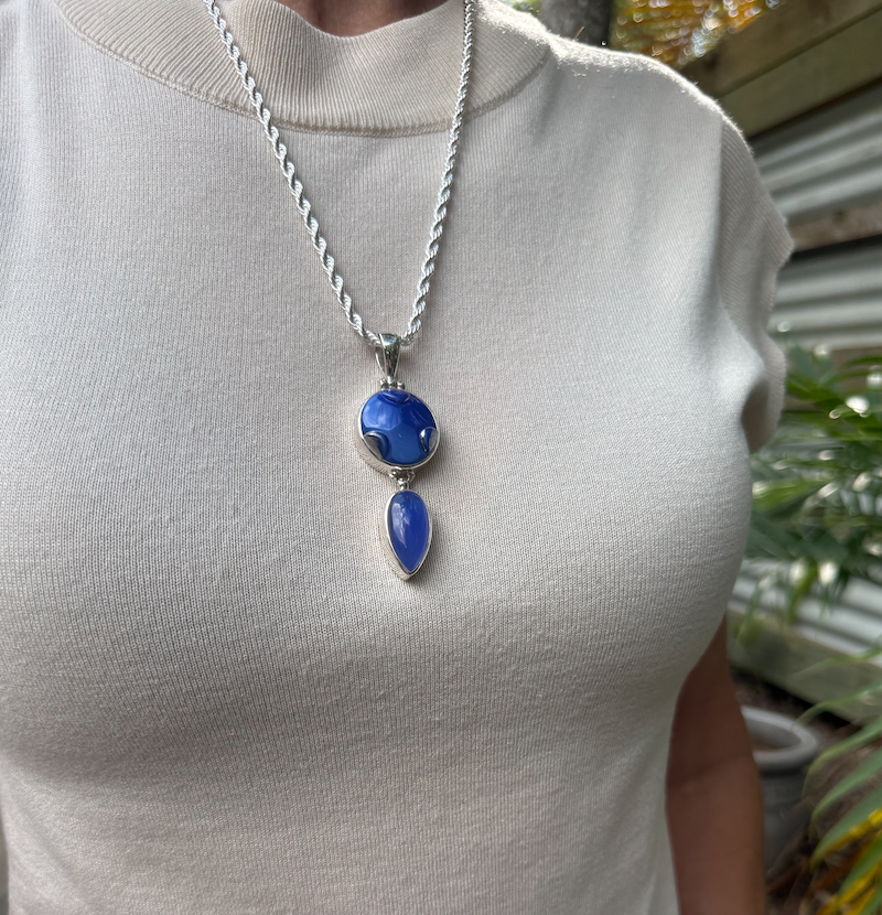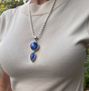 Renee says: ”Stunning one of a kind, Cobalt Blue pendant, guaranteed to delight! The top vintage 1940’s era glass Czechoslovakian button has a wee bit of silver flash within the pattern, coupled with the blue stone below. Set as always in solid sterling silver this is an iconic “Renée” piece, fresh from the studio. This pendant can be worn with the silver chain, cuff, leather cord or pearls for versatility. (Sterling silver chain included!) Jewellery that will never date or go out of style, truly “Wearable History.” Scroll thru’ images for up close peek.”