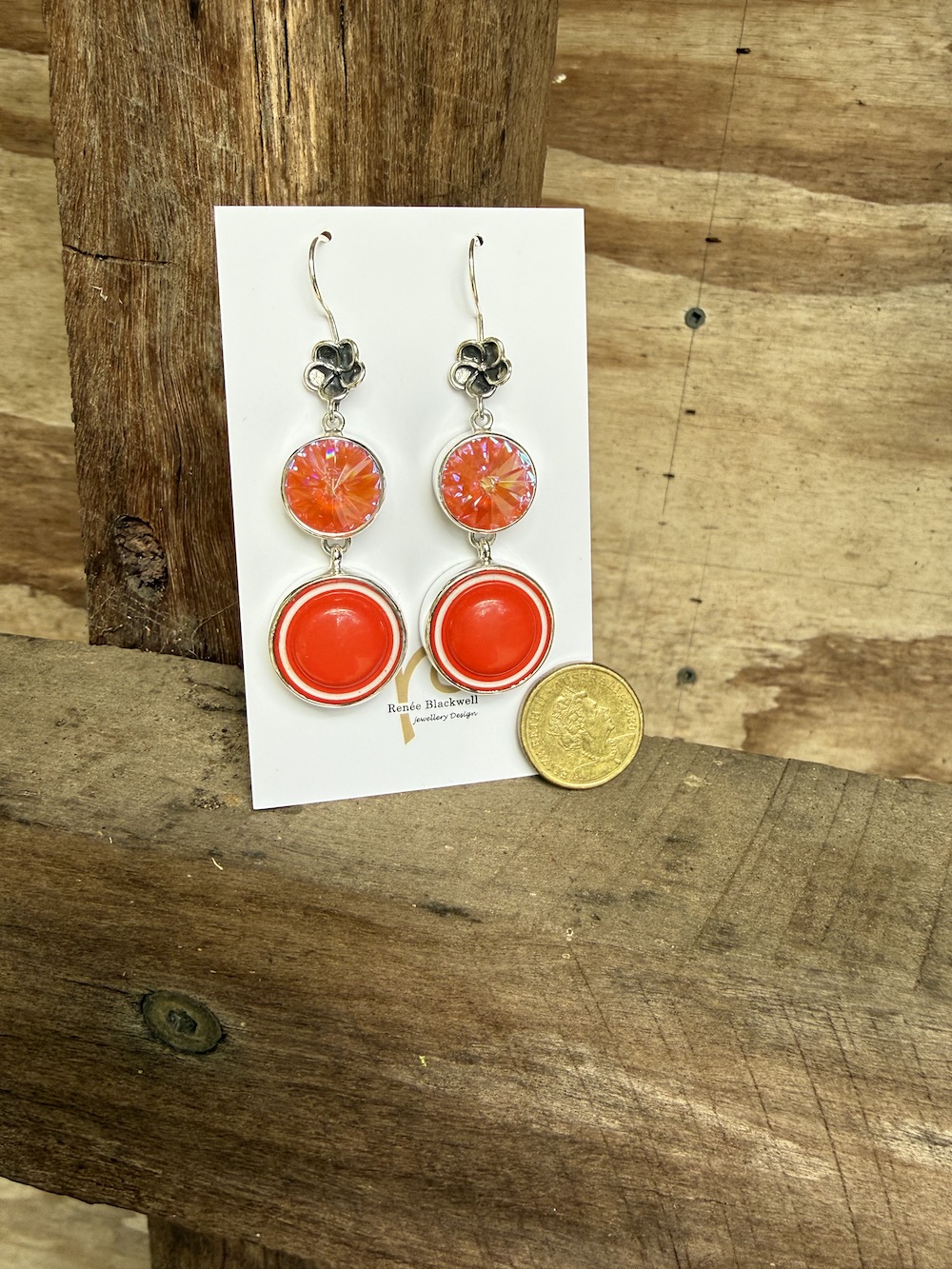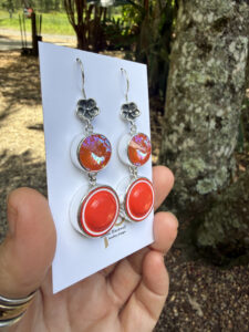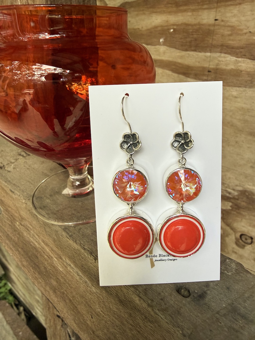 Renée says: “It’s no secret I love creating one of a kind earrings with vintage buttons, and this charming pair is the reason why! I’ve coupled the vibrant orange 1960’s era Italian buttons with the shimmering deep watermelon Swarovski crystals for a pair of earrings guaranteed to delight! Set as always in solid sterling silver and dancing from the sterling silver ear wire with a detailed flower, they will become your “go-to” colourful earrings! If you like what you see in the photos, I guarantee you will loves these as part of your jewellery wardrobe. Scroll thru’ images for up close peek at another earring treasure, fresh from the studio!”